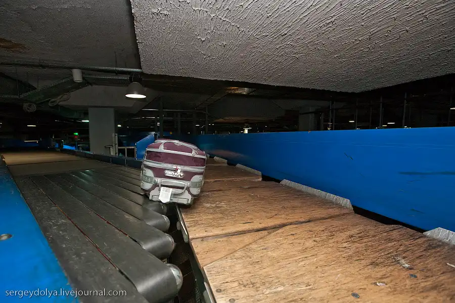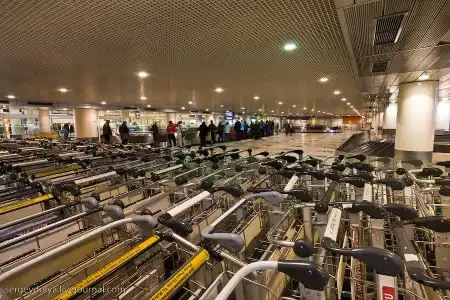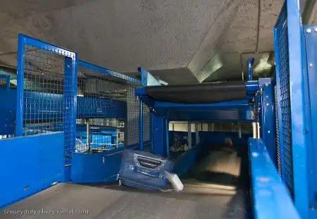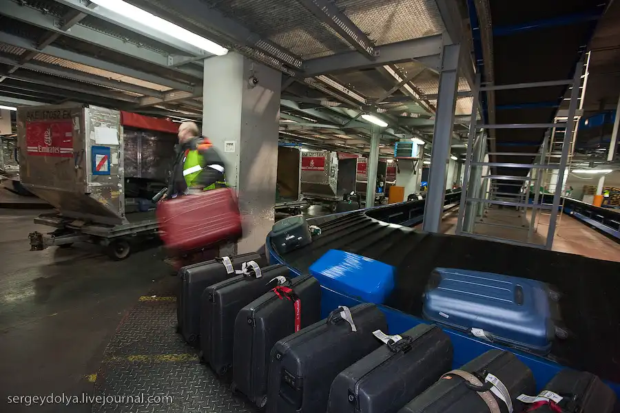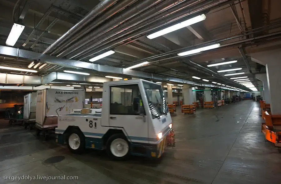 Багажное отделение занимает огромный зал, который похож на небольшой подземный город под аэропортом. Его пространство переплетает сеть багажных конвейеров, длина которых, в общем, составляет более 3,5 км. Все чемоданы спускаются сюда по одному из 6 рукавов: