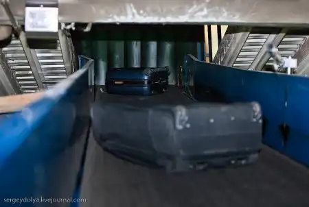 Паровозик подъезжает к одному из конвейеров, и грузчики перекладывают багаж на ленту, откуда он сразу уезжает, наверх на выдачу: