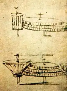 Вертолет Леонардо. С винтом из тонкого льна, пропитанного крахмалом диаметром 5 метров. Он должен был приводиться в движение четырьмя людьми, вращающими рычаги по кругу (разумеется такой мощности было бы недостаточно и, кроме того, даже в случае подъема эта конструкция стала бы вращаться вокруг своей оси