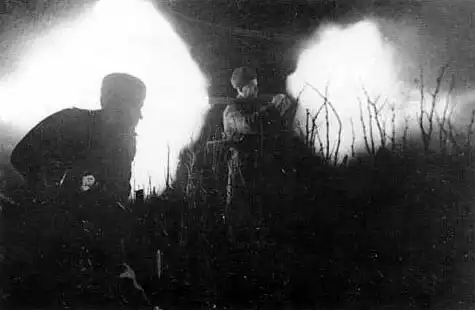 Старший сержант Киреев стреляет фаустпатроном во время ночного боя.