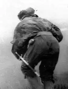 Огнеметчики подбираются к объекту атаки. Хорошо видна сумка — неизменная пренадлежность огнеметчика.