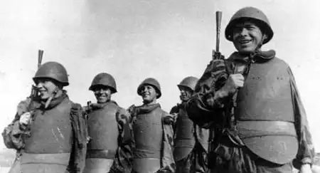 Боевое снаряжение солдат штурмовых подразделений состояло из обычной стальной каски и стального нагрудника, не пробиваемого пулями и мелкими осколками. Этот «панцирь» солдаты обычно надевали на ватник с оторванными рукавами, который служил дополнительным амортизатором, несмотря на то, что у нагрудника с внутренней стороны имелась специальная подкладка. Но бывали случаи, когда «панцирь» надевали сверху маскхалата, а также и сверху шинели.