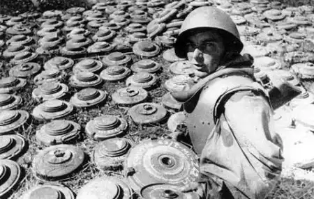 Младший сержант Червоняк у склада мин, захваченных у немцев.