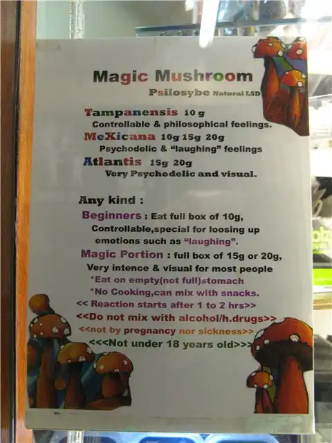 «Есть несколько видов грибов: мексиканские, тайские, гавайские (философские камни) и др., они мало чем отличаются и эффект зависит от дозы, варьируется от легкой одухотворености до сильных галлюцинаций. Там подписано Visual, Energy, Body High, Brain High и отмечена величина.