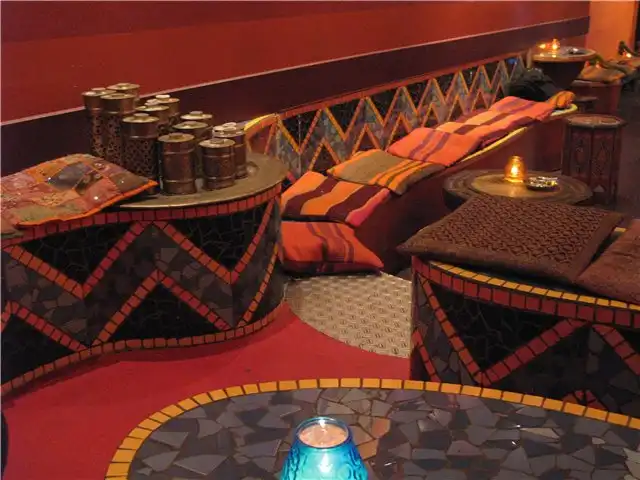 Здесь посетители сидят на пуфиках / подушках на полу или на специальных топчанах