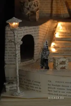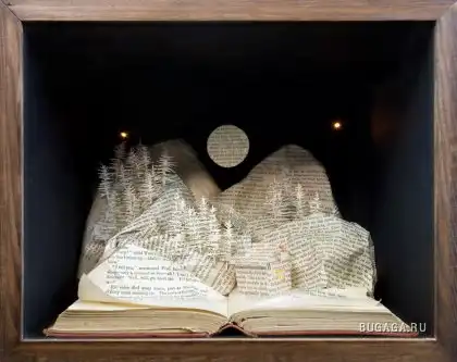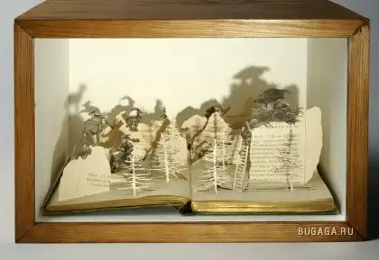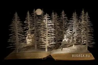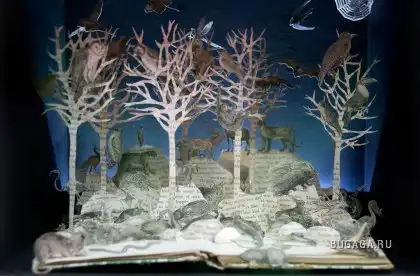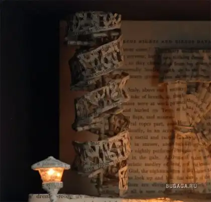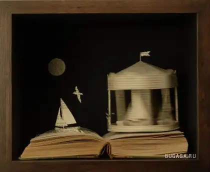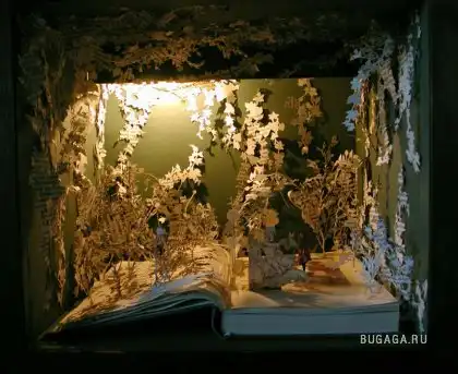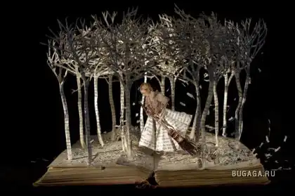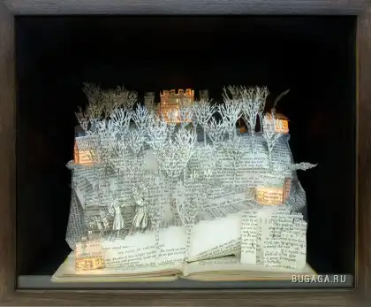 Сью Блэквелл (Su Blackwell) окончила Королевский колледж искусств в 2003 году. Она создает замысловатые произведения искусства из книг, превращая их в фантастические трехмерные миры. С помощью хирургического инструмента, скальпеля, талантливая англичанка вырезает и клеит страницы для создания миниатюрных диаграмм, освещенных светом, которые помещены в деревянные коробки или стеклянные витрины, напоминая викторианские реликвии, выставленные в музее.