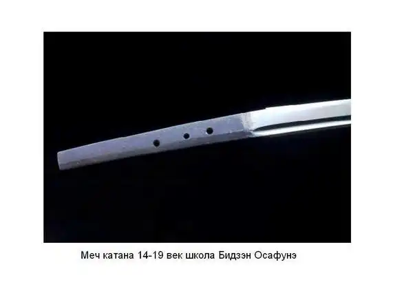 На самом деле Мурамаса — это целая династия оружейников. Согласно общепринятой версии, первым в этой семье великих мастеров был Сэнго Мурамаса, который работал в поздний период эпози Муромати (около 1460 года). Он получил духовное имя Нюдо Мёдаи, но подписывался всегда светским именем — оно состояло из двух иероглифов, которые вы можете увидеть на хвостовике меча на следующей фотографии.