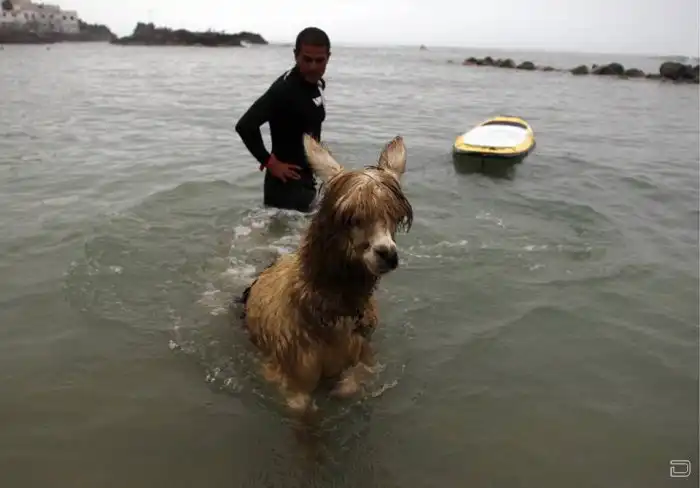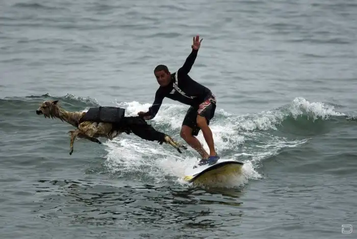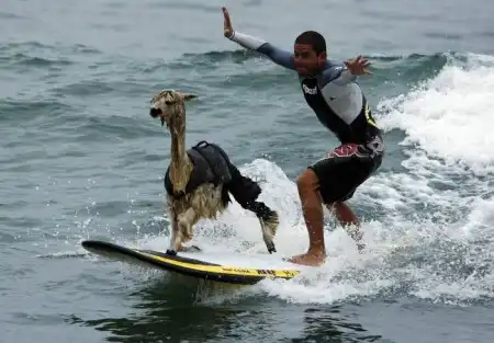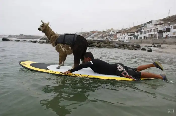 Перуанец Доминго Пьянесси научил свою альпаку кататься на доске для серфинга.Перуанский серфер Доминико Пьянесси научил рассекать по волнам свою собаку, кота, хомяка и попугая.