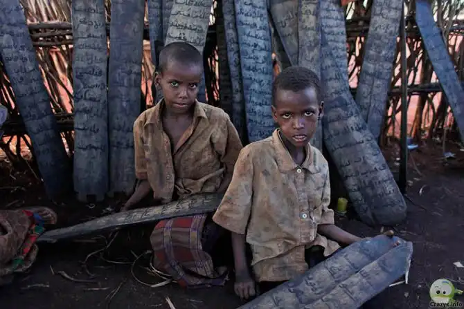 Сомалийские кенийцы сидят с деревянными дощечками со стихами из Корана в поселении Мадраса, недалеко от границы с Сомали. На традиционный образ жизни трех миллионов кочевников в Кении постепенно влияют засуха и стремительно увеличивающееся население.