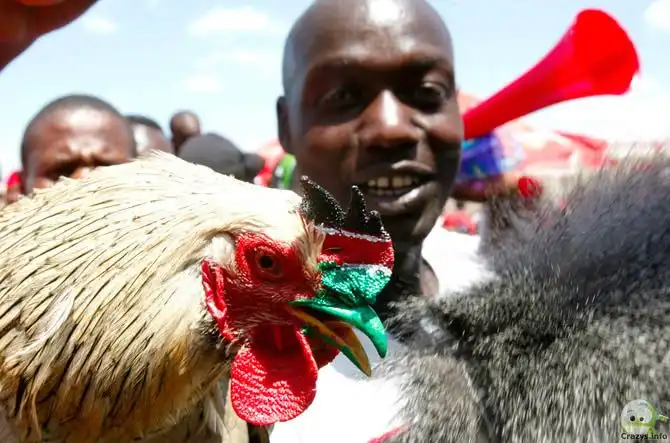 Футбольный болельщик принес на матч своего петуха, раскрашенного в национальный флаг Кении, на стадион «Nyayo» во время публичного показа кубка Чемпионата мира в столице Найроби во время его турне по 54 странам Африки в преддверии Чемпионата мира по футболу.