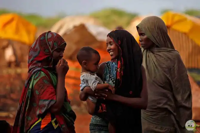 Живущая в Кении сомалийка смеется с ребенком на руках в поселении Дела, недалеко от границы с Сомали.
