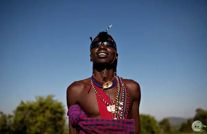 Воин масаи наблюдает за солнечным затмением в очках. Снимок сделан в Лолгориан на юго-западе Кении.