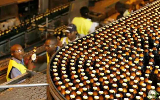 Пивные бутылки едут на конвейерной ленте на пивоваренном заводе «Руарака» в Найроби.