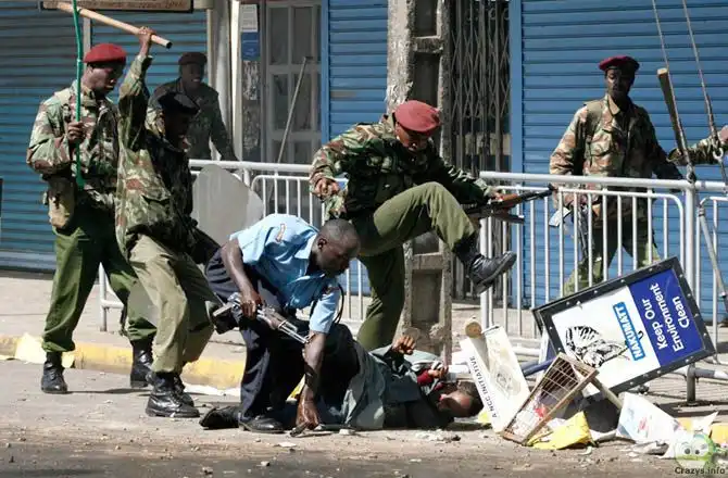 Полицейские из штурмового отряда бьют мусульманского демонстранта недалеко от мечети Джамиа в Найроби. Кенийские полицейские разгоняли сотни демонстрантов выстрелами в воздух и слезоточивым газом. Демонстранты протестовали против ареста ямайского духовного лица Шейкха Абдуллы аль-Фаисала.