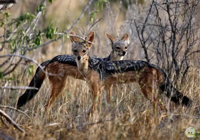 Два чепрачных шакала в траве в заповеднике Тсвао Ист в Кении.