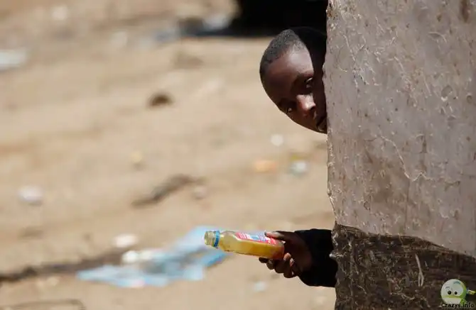 Уличный паренек с пузырьком клея смотрит из-за угла на стычку между полицией и охотниками с ястребами в Найроби во время протеста после того, как нелегальные магазинчики ястребиных охотников были снесены по указу правительства.