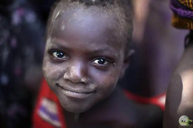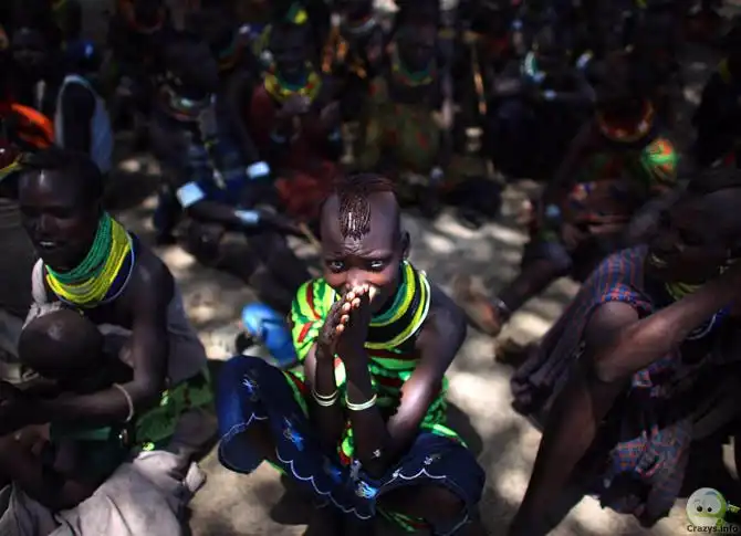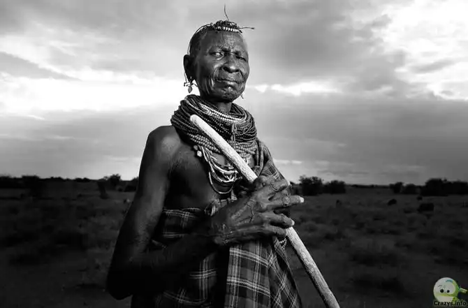Мальчик из отдаленного племени Туркана в северной Кении позирует фотографу, пока жители деревни ждут, чтобы узнать, выберут ли их другие жители деревни, чтобы предоставить помощь в еде, в деревне Кокуру, недалеко от Лодвара. Жители сами решают (в результате демократического голосования), какая семья получит еду. Одни семьи зачастую делятся едой с другими.