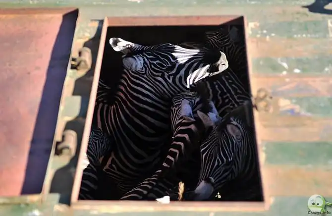 Зебры в контейнере, который погрузят в грузовик в заповеднике Сайсамбу в Накуру. Зебр перевозили в национальный парк Амбосели. Кенийские работники службы защиты дикой природы начали перевозку тысяч зебр в регион, где из-за засухи вымерли целые стада зебр и буйволов, из-за чего львы начали нападать на домашний скот близлежащих ферм. Операция по перевозке зебр длилась до конца февраля, это была одна из крупнейших перевозок животных в Африке. Кенийская служба защиты дикой природы перевезла около 7000 тысяч животных – 4000 зебр и 3000 буйволов.