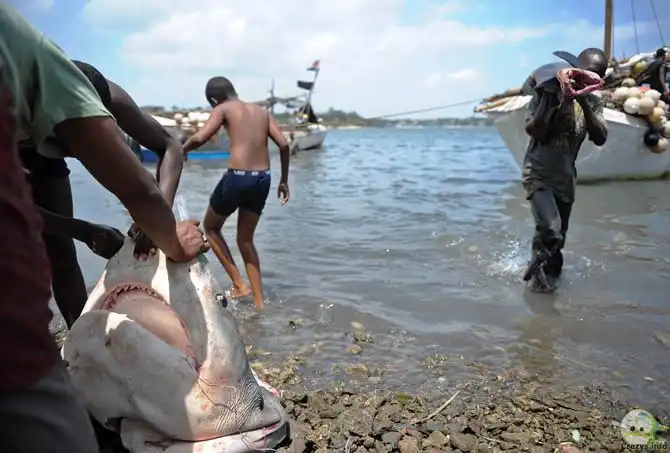 Кенийский рыбак пытается вытащить крючок из челюсти акулы в прибрежном городе Момбаса. Последнее время каждый раз, когда кенийский рыбак отправляется рыбачить в Индийский океан, он привозит с собой, по меньшей мере, на 200 кг больше улова. С тех пор, как сомалийские пираты начали свою деятельность в 2007 году, промышленные судна избегают рыбачить в этих районах, оставляя добычу местным рыбакам.