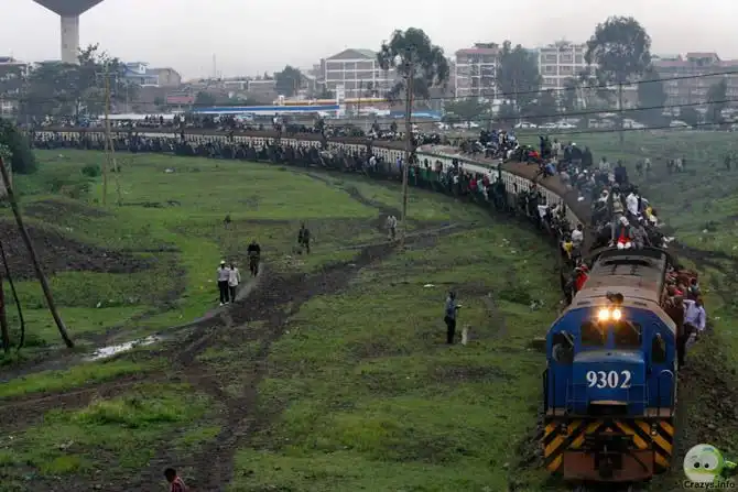 Пассажиры едут на переполненном поезде, направляющемся в столицу Кении Найроби. После забастовки водителей и кондукторов из-за вымогательства и коррупции со стороны такси, общественный транспорт Кении встал на несколько дней.