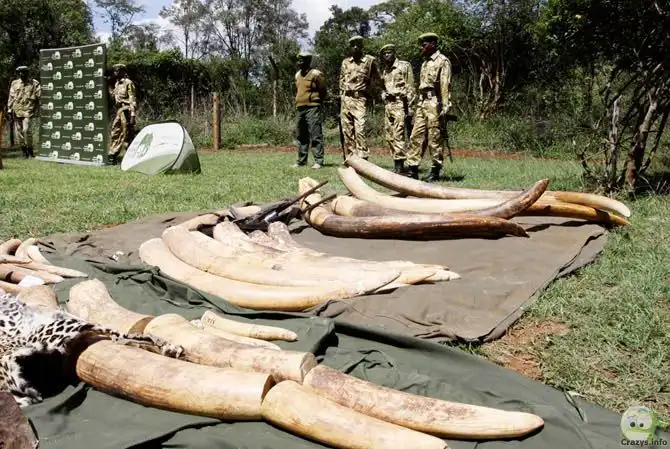 Работники кенийской службы защиты дикой природы смотрят на конфискованные бивни слонов в Найроби. Работники Африканской службы защиты дикой природы конфисковали почти 1700 кг слоновьих бивней в рамках недавней операции с участием шести наций. Было арестовано 65 человек.