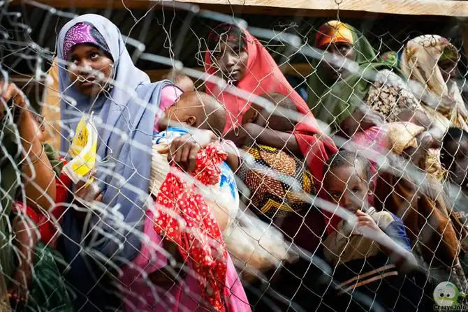 Сомалийские женщины с детьми на руках стоят в очереди за колючей проволокой в центре раздачи еды в лагере для беженцев Ифо, Дадааб, 4 ноября. Дадааб – крупнейший лагерь для беженцев во всей Африке, здесь живет около 250 000 человек, которые сбежали из мест многолетнего конфликта в Сомали.