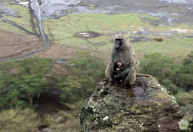 Детеныш бабуина цепляется за мать на фоне высыхающего озера Накуру в Кении.