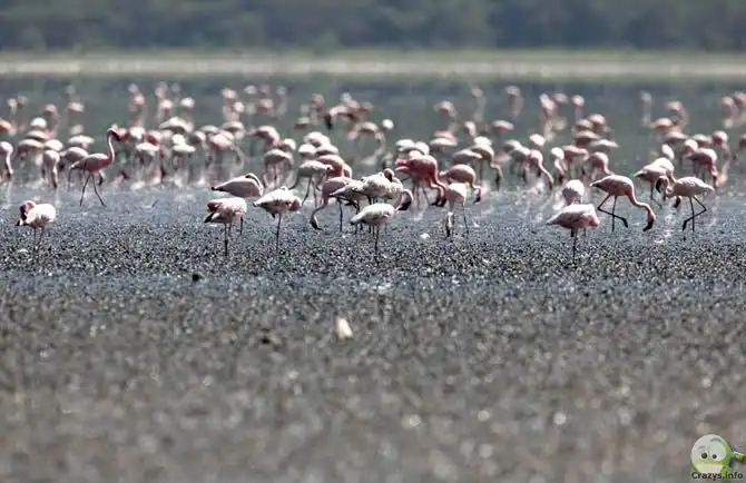 Розовые фламинго ходят по озеру Накуру в 160 км к западу от Найроби.
