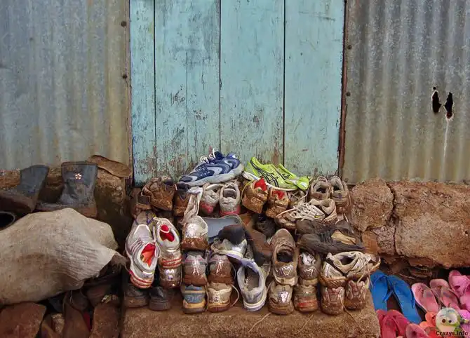 Кроссовки кенийских спортсменов-юниоров лежат у входа в спортзал клуба «Киптенден» в округе Керихо. Клуб был закрыт из-за обвинений в сексуальных домогательствах к спортсменам. Этот инцидент поставил крест на надеждах многих бегунов добиться успехов в спорте и тем самым избежать бедности.