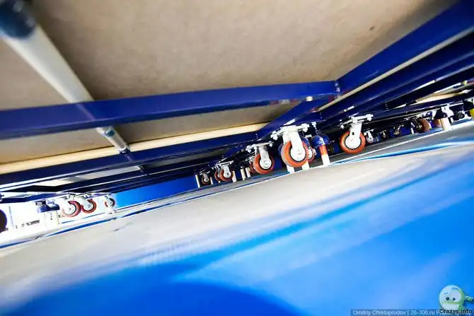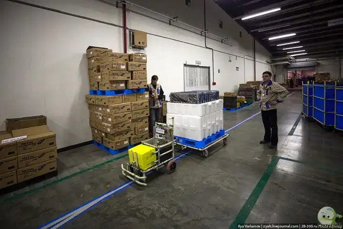 31. Каждый контейнер имеет колесики, по мере необходимости роботы развозят эти контейнеры людям на конвейерах.