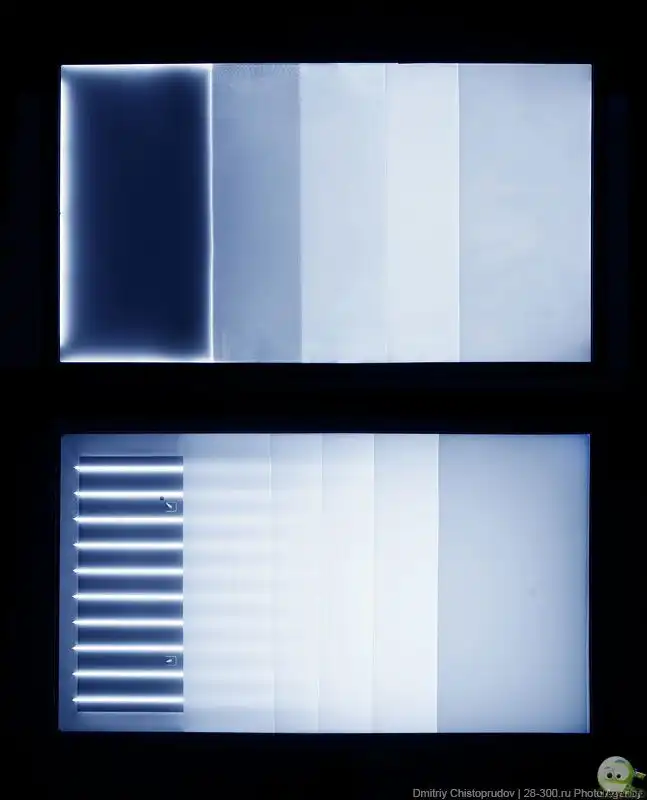 69. Сверху — телевизор с подсветкой Edge LED (торцевая белая светодиодная подсветка), снизу – обычный с флоуресцентными лампами с холодным катодом. Слева направо показаны специальные светораспределяющие слои для равномерной подсветки.