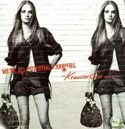 10. Рекламная кампания «We all have Aids»/«У нас у всех спид» модного дизайнера Kenneth Cole вызвала недовольство, потому что внешне была очень похожа на обычную гламурную рекламу фэшн бренда. Слоган «We’re all potential carriers»/«Мы все потенциальные носители» относится не к сумке в руке модели, а к вирусу СПИДа.