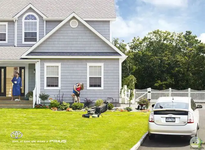 5. Toyota вероятно сожалеет о созданной ими кампании для экологичного автомобиля Prius . Постеры демонстрирую три аморальные сцены — убийство, проституцию и измену — сопровождаемые тэглайном «Ну, хотя бы он водит Prius».