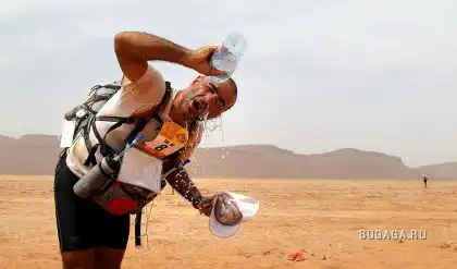Участник забега освежается в ходе двухдневного этапа «Песчаного марафона», Уарзазат, Марокко, среда. «Песчаный марафон» (Marathon des Sables) считается одним из самых сложных забегов в мире. Каждый из участников забега несет с собой шприц с противоядием (в пустыне много змей), сигнальные ракеты - на случай, если потеряется, и недельный запас пищи - в пути бегуны будут получать только воду. Протяженность марафона составляет 150 миль и продолжается он целую неделю. (Pierre Verdy/ AFP/Getty Images)