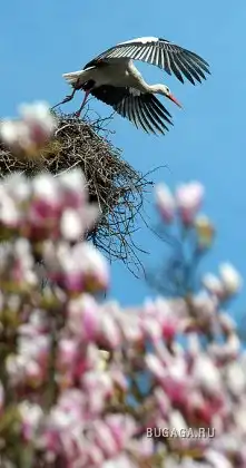 Аист вылетает из гнезда, свитого на дереве магнолии в Страсбурге. (AP)