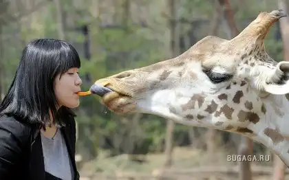 В Южной Корее посетительница зоопрака кормит жирафа морковью. (AP)