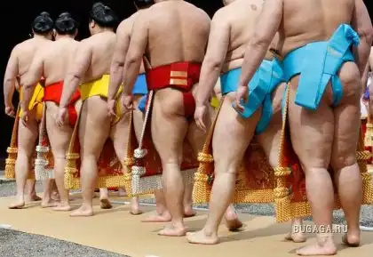Сумоисты выстраиваются в одну линию во время ритуальной церемонии в начале ежегодного турнира по сумо, посвященному храму Ясукуни, Токио. (REUTERS)
