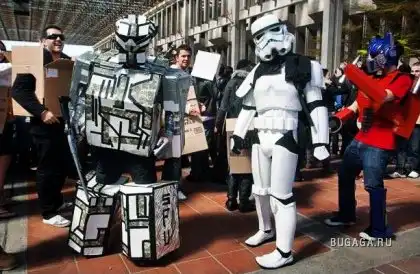 Студенты в костюмах роботов из картонных коробок принимают участие в Robot Rock в университете Саймона Фрейзера в Барнаби, Британская Колумбия, Канада. Студенты пытались побить Мировой рекорд по количеству людей, танцующих в костюмах роботов. (AP)