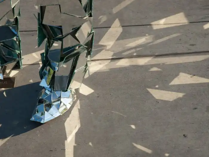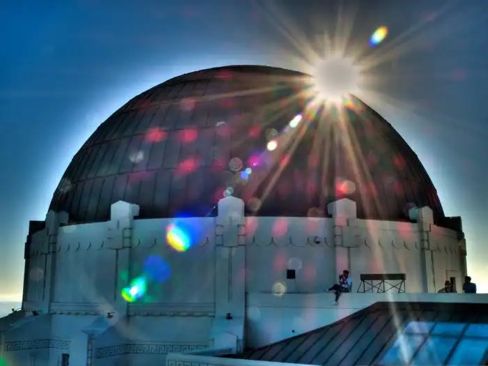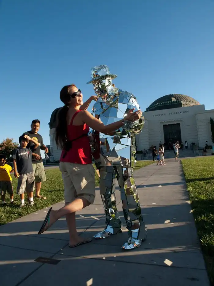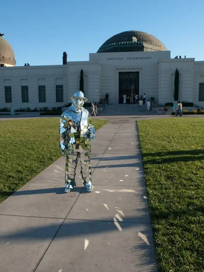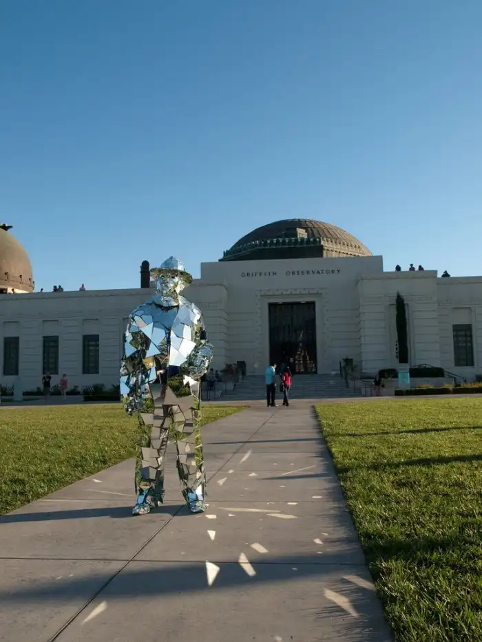 Скульптура зеркального человека привлекает посетителей обсерватории Грифит (Griffith Observatory, LA) в Лос-Анжелесе.