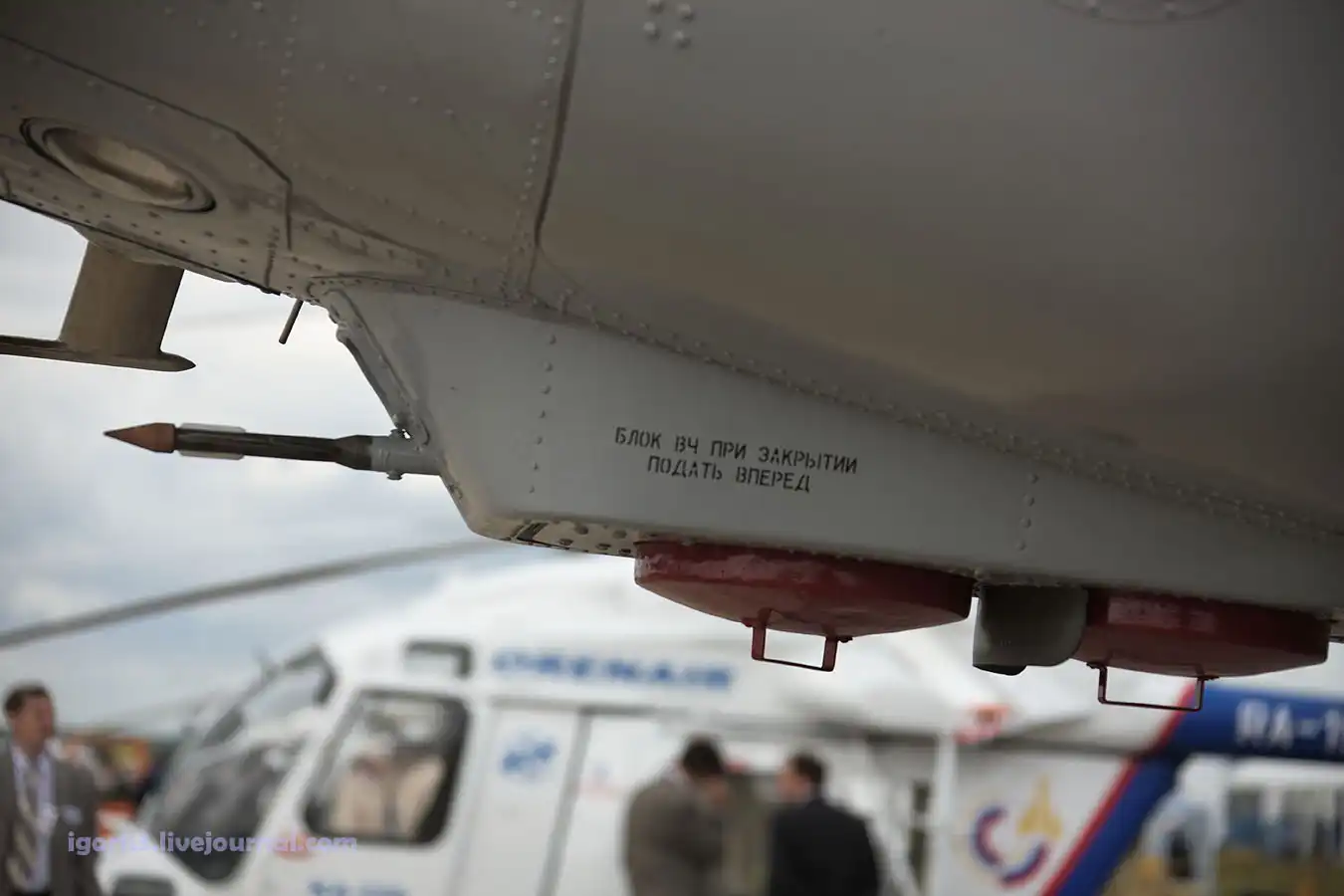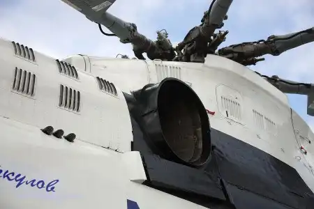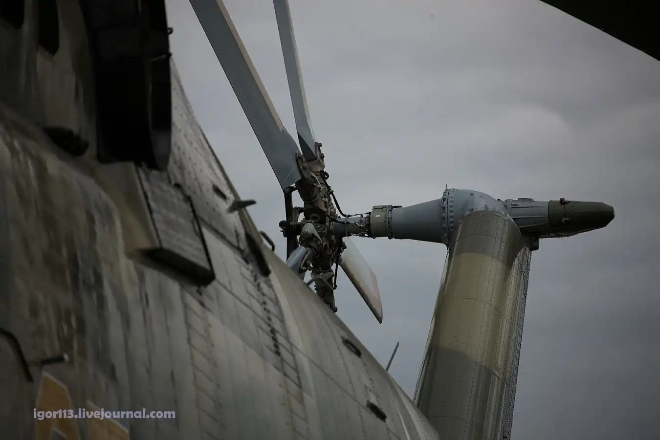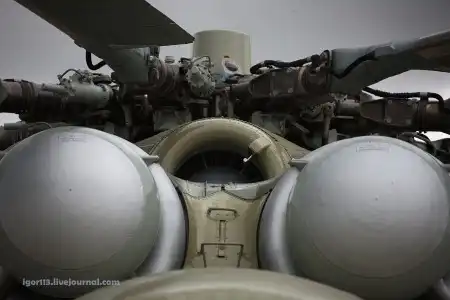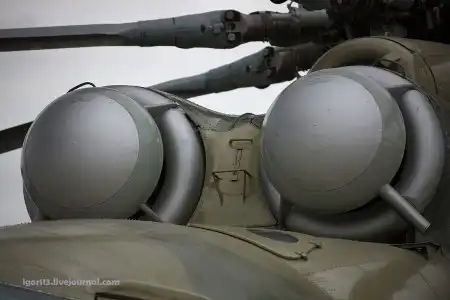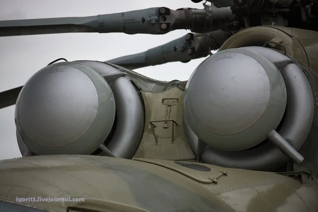 двигателей пылезащитные устройства (ПЗУ) грибкового типа со степенью очистки 65-70%, использующие центробежный эффект для улавливания посторонних частиц. Это позволило в дальнейшем вертолету работать с пыльных площадок практически без уменьшения ресурса двигателей при минимальном снижении их мощности. Чтобы обходиться без аэродромных источников электропитания и сжатого воздуха, вертолет оснастили ВСУ. А чтобы не прибегать при