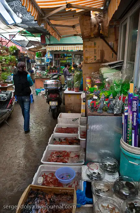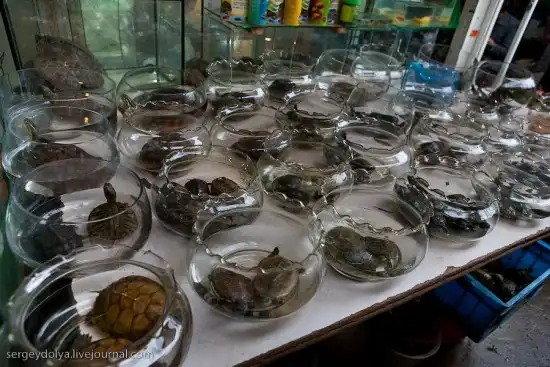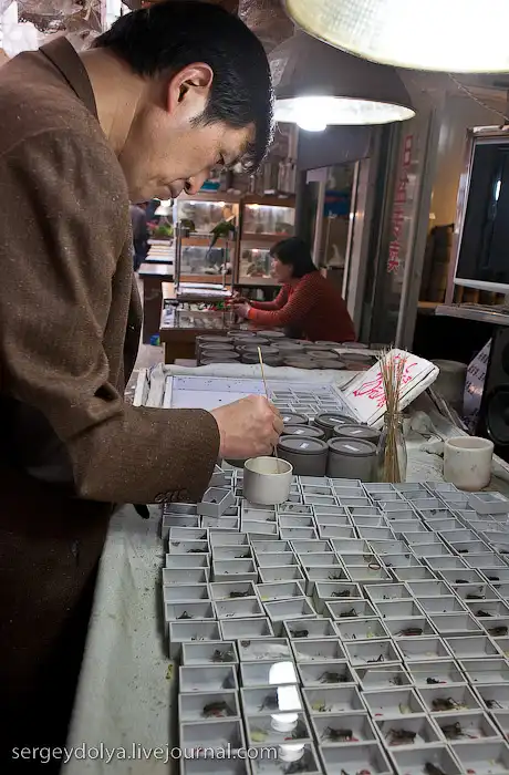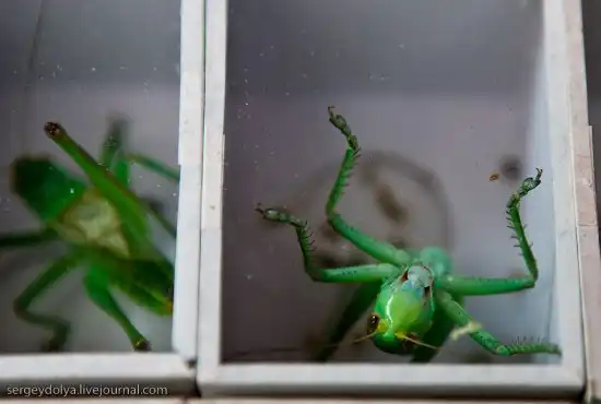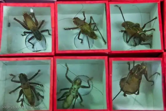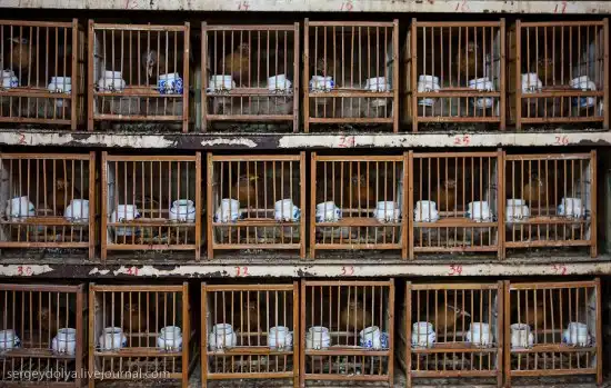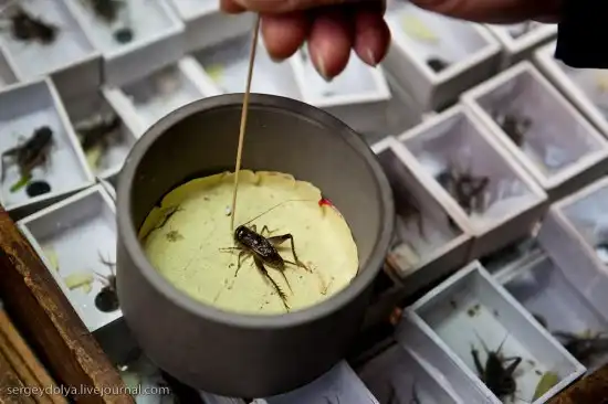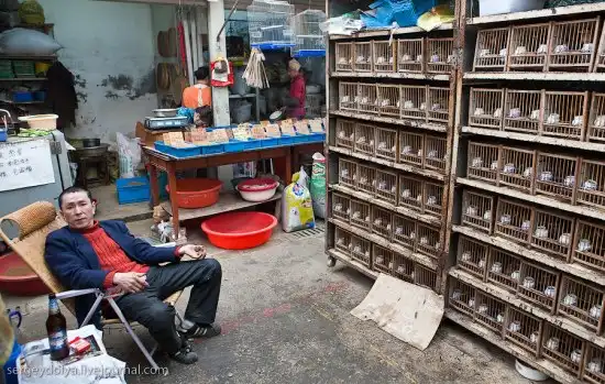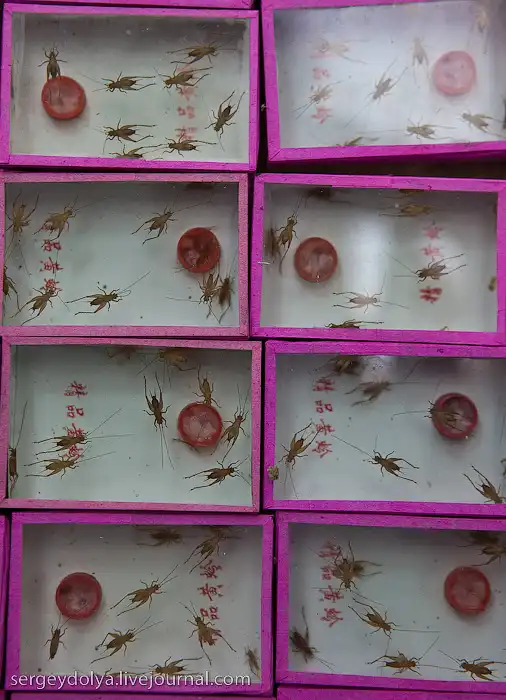 В Шанхае Сергей Доля побывал на местном "Птичий рынок". Здесь продают утят, кроликов, мышей, птиц, рыбок, лягушек, черепах и много еще кого. Больше всего меня удивили насекомые. Я впервые видел их в таком количестве. Интересно наблюдать процесс выбора таракана для будущих боев. А еще тут много "певчих" насекомых…