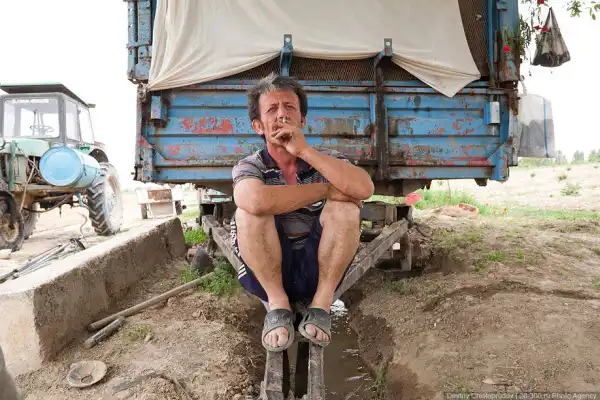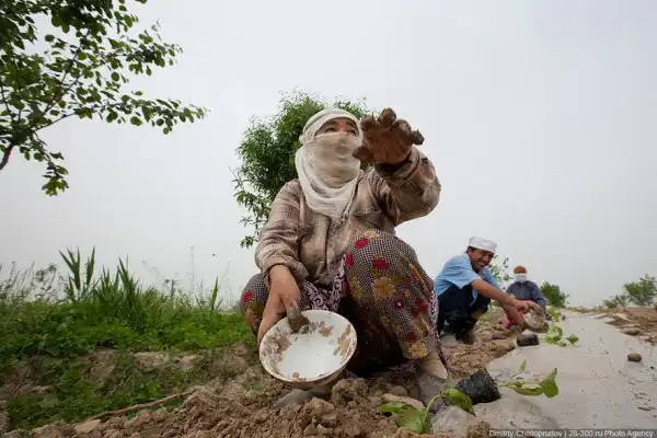14. Эта группа товарищей сажает узбекские дыни. Когда дыньки вырастут, их можно будет купить прямо на поле по 20 рублей за штуку.