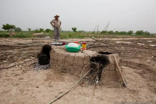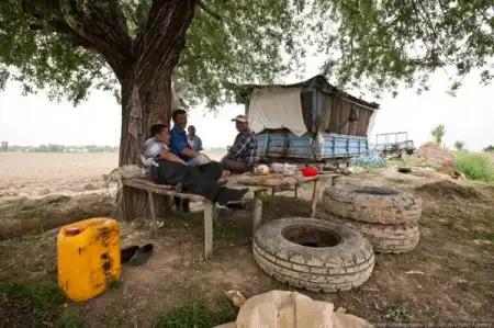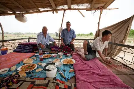 8. Следующую остановку мы сделали в поле, где дружная семья сажала арбузы и дыни. Мы приехали как раз к обеду.