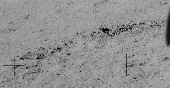 Фотографии следов камней сделанные «Лунар орбитер-5». Это не те же самые следы, что видят астронавты в кратере Нансена, или около ЛМ. Поскольку следы на фотографиях сделанных с орбиты значительно более крупные чем те что затем астронавты фотографируют на поверхности. Например, самый большой след на этой фотографии составляет 25 метров! А следы из кратера Нансена, на таком расстоянии, можно было бы рассмотреть только под лупой!