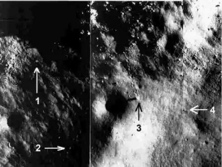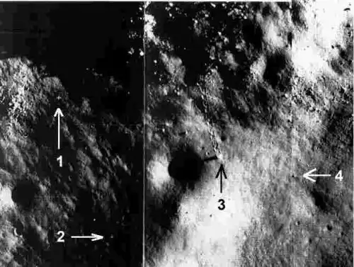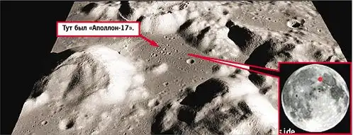 Фотография из статьи, стрелка А, указывает на серое пятнышко точно расположенное в месте посадки Аполлон-15. Фотография сделана американским военным спутником Клементина, сфотографировавшим места посадок по миссии «Аполлон». К сожалению, разрешение фотографий очень низкое.