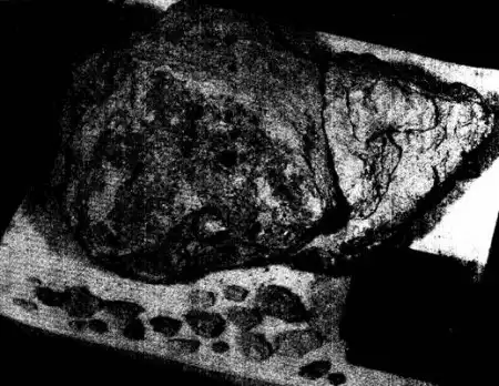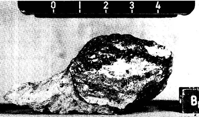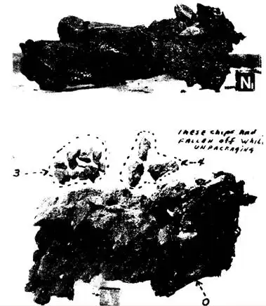 Содержимое перемешалось, все камни загрязнены и на фотографии показана реконструкция камня. Исследования показали «оболочка» заполнена камнями химически неоднородного состава.