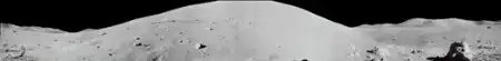 Причем, не помещая след обязательно в центр кадра, так что бы вдаль уходила вереница отпечатков, а как получится. Что попадет в кадр то и попадет. Поэтому на большей части фотографий видны холмы и кратеры, т. е. боковые и удаленные панорамы, на которых из-за расстояния следов не видно, а если видно, то не четко. При этом, рядом, впереди ровера, но за кадром, проходит хорошо видимая цепочка следов, по которой астронавты и следуют.