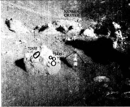 142:41:39 Шмитт: Взгляни на эти каменные глыбы! Следы их качения ведут на дно кратера Нансен.