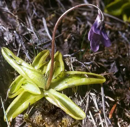 Зеленые листья жирянки также распластаны по поверхности мохового покрова, но они значительно крупнее, чем у росянки. Поверхность пластинки листа покрыта слизью, отчего листья кажутся жирными, поэтому-то и растение называется жирянкой. Под микроскопом на срезе листа можно увидеть, что вся поверхность его пластинки усеяна желёзками двух типов: одни из них — головчатые, на ножках, напоминающие шляпочные грибы; другие — без ножки, сидячие. Возможно, что желёзки на ножках выделяют пищеварительные соки, а сидячие — всасывают переваренную пищу.