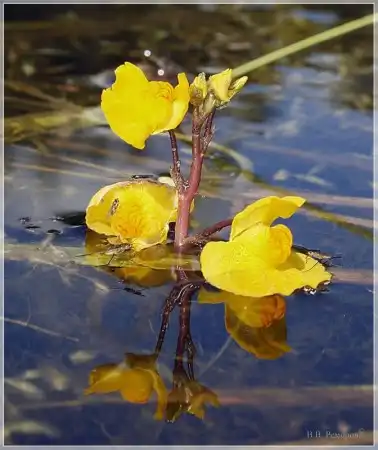 В болотной воде между кочками торфяного мха и в других стоячих водоемах встречается еще одно интересное насекомоядное растение — пузырчатка. Ее сильно рассеченные листья плавают в воде. Над водой виден лишь стебель с сидящими на нем довольно крупными ярко-желтыми цветками.